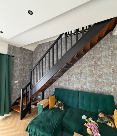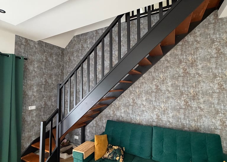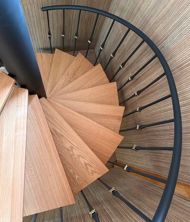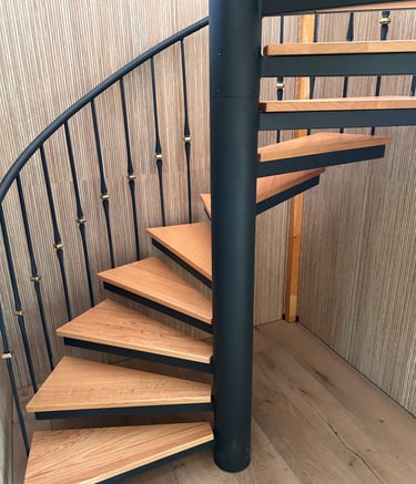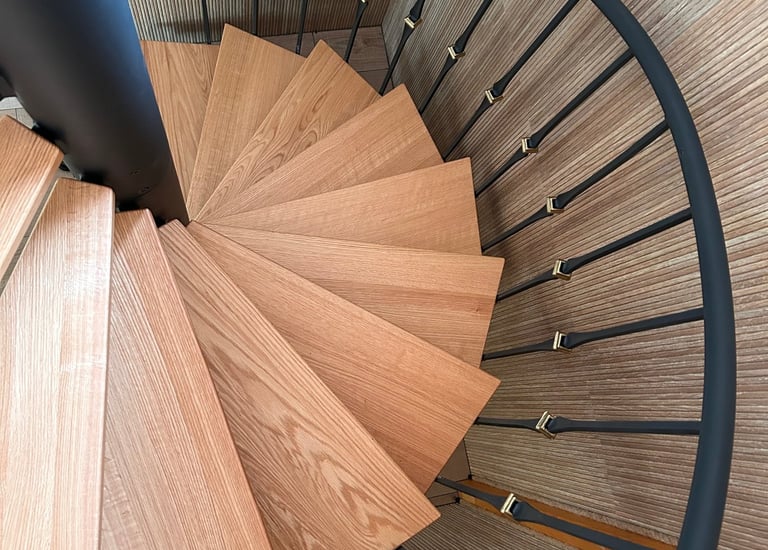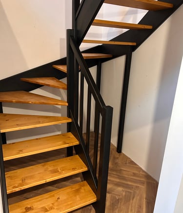 Dębowe schody zabiegowe na konstrukcji stalowej